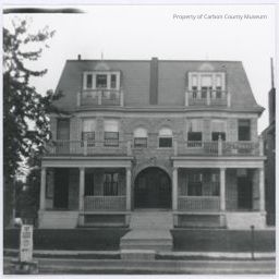 Black & white copy print of a multi-level house. Top level has large dormer windows with fenced balconies. Second level has doors on either side & windows, the second in the middle are arched. Bottom level has a covered veranda with large columns, decorative fencing & three sets of steps to ground. A large arch door for center entry & a door on either side near edge. Grass is beside a wide walk going to street. Another walk & a strip of grass is before the curb & street.