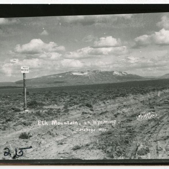 a) "Elk Mountain, in Wyoming, Saratoga Wyo." An image of Elk Mountain from a distance. There is a dirt road in foreground at right, with a sign towards the left "Miles to Medicine Bow Lodge". Written in bottom left corner in black ink: "#215".