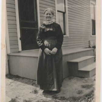 Black & white snapshot print of Rosa Rankin and four copies. She is wearing a dark, long dress with white lace collar. Her hair is pinned back in soft curls. She stands on the ground beside steps going up to a clapboard house.