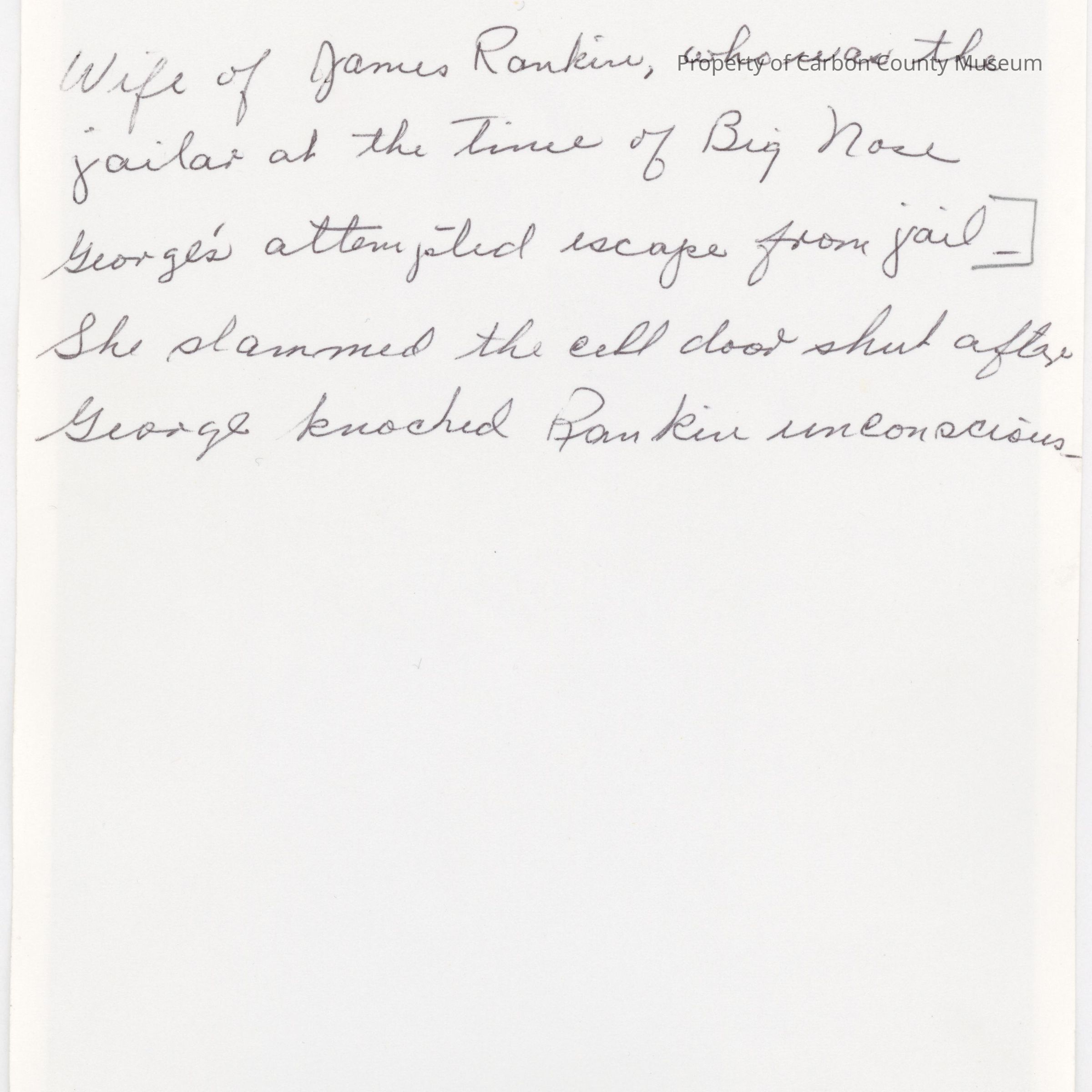 Written on the back in blue ink: "Mrs. Rosa Rankin" In black ink: "Wife of James Rankin, who was the jailer at the time of Big Nose George's attempted escape from jail. She slammed the cell door shut after George knocked Rankin unconscious"