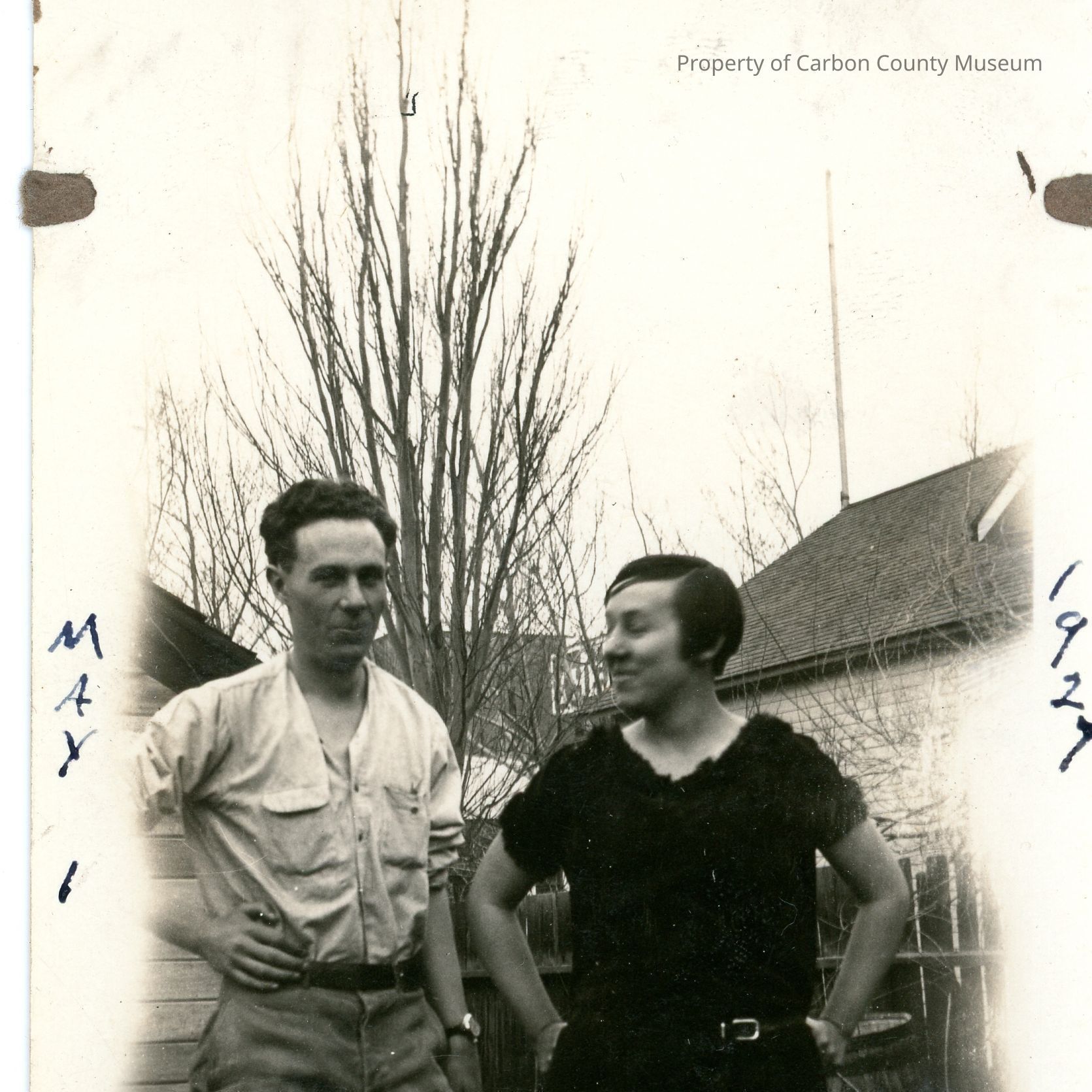 Black and white photograph. A young man and a young women are standing beside each other in a house's lawn. Written along the top edge pf the photograph is "RAWLINS", written along the bottom is "GILBERT - ME", written vertically along the left edge is "MAY 1", and written vertically along the right edge is "1929". Written on the back of the photograph is "Gilbert and Edith Buchanan."Collection