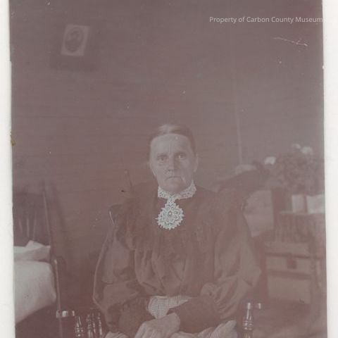 Update 2008: Sepia print. Snapshot. 3/4 image of a woman seated in a turned wood chair with arms in a room with other furniture in the background. Woman is wearing a light colored checked skirt, dark long sleeved blouse with lace on cuffs, bodice top and shoulders and a crocheted white collar with circular pendant in front.