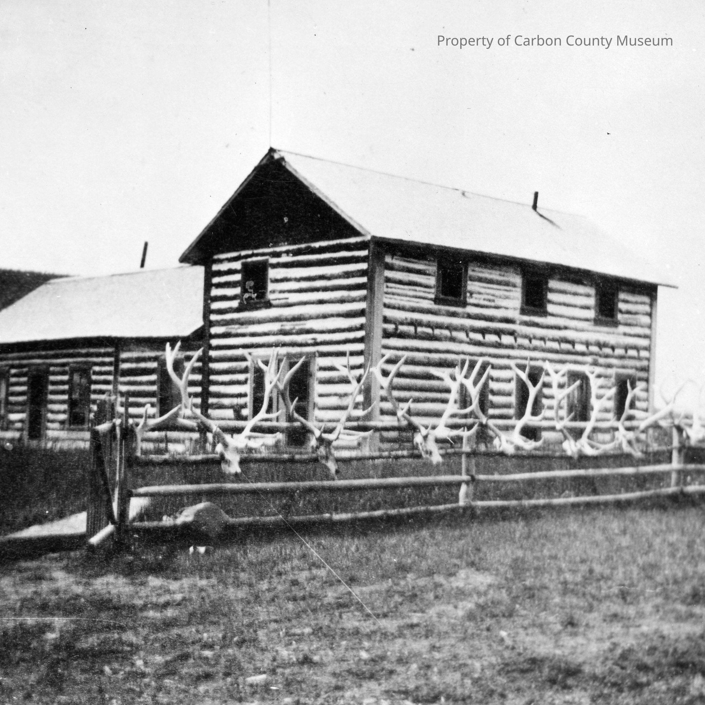 Update - 2009: Black & white print. Snapshot. Image of a multistory log building surrounded by a log fence decorated with deer/elk skulls & antlers. Grassy area in foreground; hill in background left.