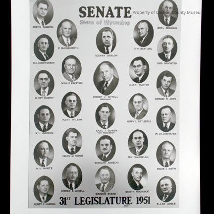 Update: 12/2010 Removed from frames. Two black and white prints. Images of head and shoulder pose of men and women who served in the Wyoming State Senate and Wyoming House of Representatives in 1951. Print 1: At top printed in black : "Senate, State of Wyoming" "31st legislature 1951". Small black print at bottom: Hugh Bates Cheyenne". Twenty seven faces and names are shown in oval prints. Written on back in pencil: "No. 470 Catalog 4 E. P. Murphy". Condition is good, wrinkled at top and bottom, soiled.