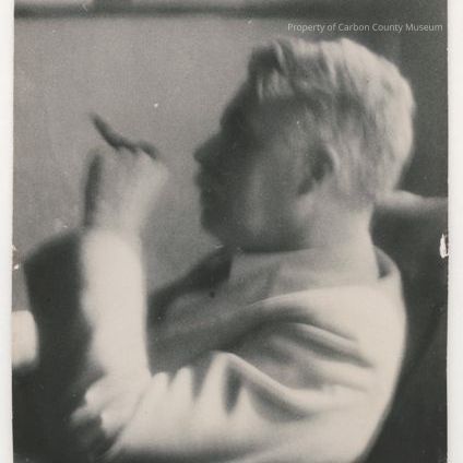 Update 2009: Black and white print of left profile of older gentleman. He has white hair. He is wearing a light colored jacket and shirt with a dark tie. in his left hand there is a cigar. his left arm is resting on a wood chair arm and is raised at the elbow. There is a shelf in the background that holds a light colored box and what appears to be a stack of papers.