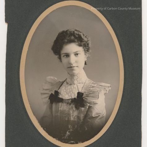 Update 2009: Black and white studio portrait of a young lady and one copy. She has her dark hair pulled up and back, appears to be tied back at her neck. She is wearing a very ornate light colored dress. It has a lace high neck and yoke. The shoulders are scalloped out to a ruffle extending out over long sleeves. There are two dark colored bows on bottom of lace yoke at the bottom of scallops. Photographer name partially cut off lower right "Clims" "r main St." "St. Jo".