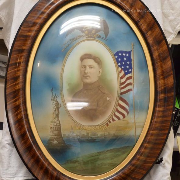 Portrait of Chris Keldsen set in a decorative mat and large oval frame with curved glass front. The portrait is B/W but the mat is colored; background is mottled blue with a bald eagle at the top, the American flag on the right, and the Statue of Liberty at the lower left. The printed portrait frame reads "Victors" at the bottom, making it likely that this portrait was created around the time of Keldsen's discharge in 1919. He is in a military uniform for the portrait. The frame is wood with a painted brown bristle/sunburst(?) pattern and golden inner circle. Cardboard backing has "Chris Keldsen, World War I" written on it.Collection