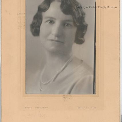 Update 2009: Black and white studio portrait. Lady with dark hair worn in a waved bob. She has on a light colored dress with V neck and has a double strand pearl necklace. Mounted in a cream colored window mat.