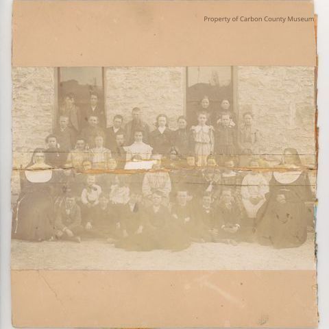 Update 2008: Sepia print. Snapshot. Mounted on tan matboard and cardboard. Group of children and two nuns seated and standing in front of a stone building. Girls are in dresses. Boys are in suits. Large black dog lying on ground in front of group.