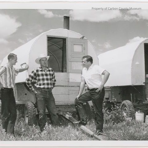 Black & white print. Snapshot. Image of two sheep wagons, parked side by side, on a grassy field. Three men standing at front of left wagon. Man at right is standing with his right foot on the tongue; he is wearing dark pants, boots & a white short sleeve shirt. Man at center is dressed in jeans & a long sleeve plaid shirt; he has on a white hat & glasses & is standing with his hands in his back pockets. Man at left is dressed in jeans & a short sleeve striped shirt; his left hand -holding sunglasses - is resting on side of wagon top; his other hand is on his back.