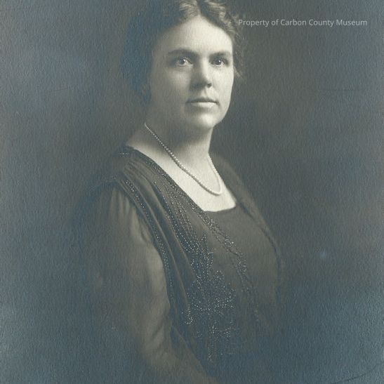 B/W portrait of Doris (Larson) Mosher, dated 1924. She would have been around 45 years old. A picture of a middle-aged woman wearing a dark/black beaded gown. She has dark hair parted down the middle and is wearing a pearl necklace.Collection