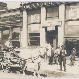 Sepia print. Snapshot. Printed on postcard paper. Unused. Image of businesses on 300 block of Front St. Sign above store reads: "Golden Grain Belt Beers". Other signs on front: "Anderson & Larson Diplomat Rye." In a window: "Buffalo Bills Wild West Pawnee Bills Rawlins Saturday July 26". Building to photo left is Tivoli Bar. Sign on store is vertical hanging: "TIVOLI". A wagon sits on street in front of buildings, a man is on seat holding reins of light colored horse. Six men stand on walk in front of window with painted sign reading: "Minneapolis Beer Hall".