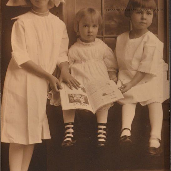 B/W studio portrait of the daughters of Elias and Doris Mosher. Picture of 3 young girls, all in light colored dresses with dark/black shoes. The oldest is standing on the left while the other 2 are seated on a trunk or bench. Probably taken around 1915.