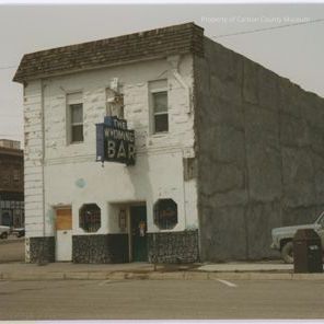 Color print. Snapshot. Image of a narrow two story building (concrete & brick?) with a shake shingle roof facing. Tall narrow windows in upper story on either side of lighted sign "The Wyoming Bar". Octagonal windows on either side of door on lower floor; second boarded up door at left. Paved street in front & at left; other buildings in background left.