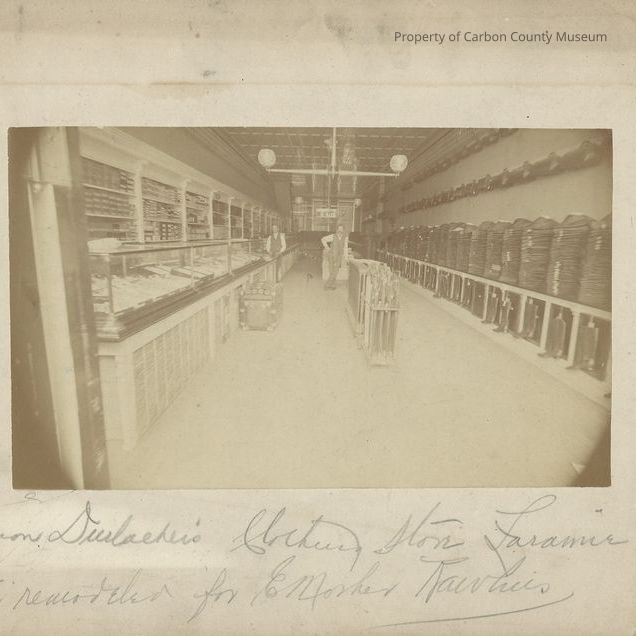 B/W of the interior of one of Elias Mosher's clothing stores. Note on mat: "Simon Durlaeker's[?] clothing store Laramie, later remodeled for E. Mosher Rawlins". Probably taken in 1880s or 1890s. It is unclear from the written notation whether this store is located in Rawlins or Laramie.Collection