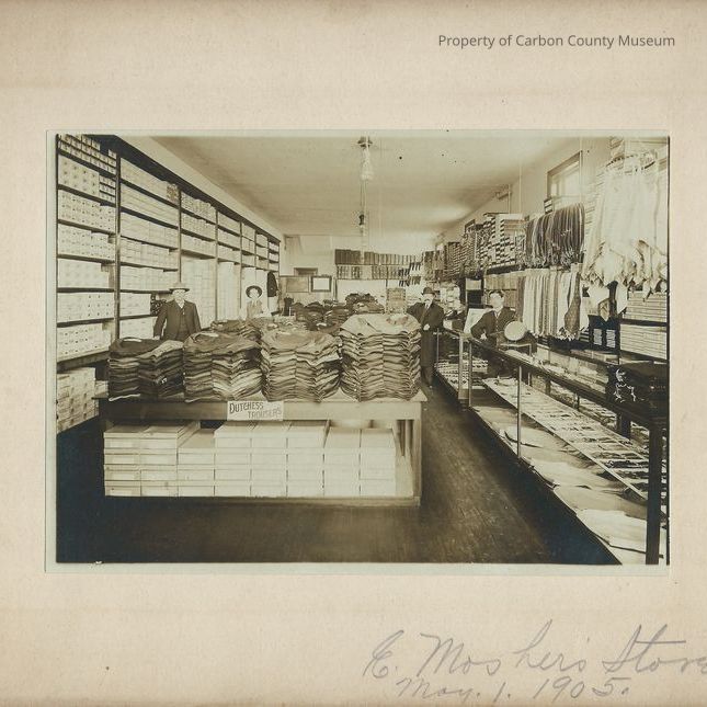 B/W photo of the interior of Elias Mosher's Rawlins store, dated 1905. There are 4 men standing across the midground, Mosher is on the far right behind the counter.Collection