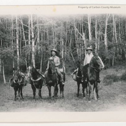 Update - 2009: Black & white print of two mounted riders & three additional pack horses. Pack horses have fully loaded panniers. The two men are wearing cowboy hats & one has a pack horse tethered to his horse and the other man has two pack horses tethered to his horse. They are in a grassy clearing in front of a slope covered with aspen trees.