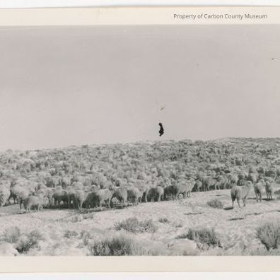 Update - 2009: Black & white print of a large band of sheep. In the foreground is sparse sagebrush and the ground has snow.