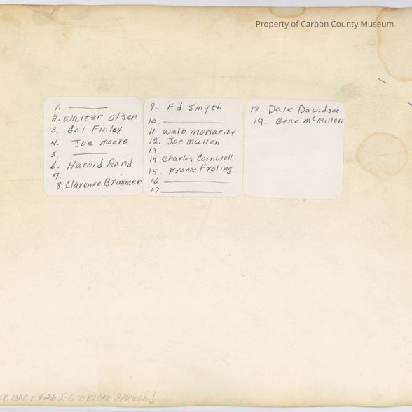 Written on back in blue ink: "Sept- 1955" Written on back in black ink on white adhesive labels pasted on back: "1.[blank] 2. Walter Olsen 3. Gal Finley 4. Joe Moore 5. [blank] 6. Harold Rand 7. [blank] 8. Clarence Brimmer 9. Ed Smyth 10. [blank] 11. Walt Moriarity 12. Joe Muller 13. [blank] 14. Charles Cornwell 14. Frank Froling 16 & 17 [blank] 18. Dale Davidson 19. Gene McMilden"