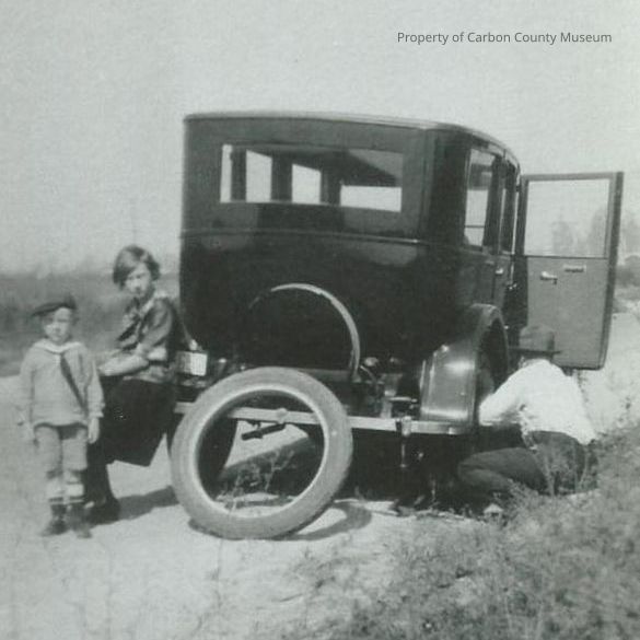 Oscar Larson with his children, Robert and Geraldine, taken in the 1920s. B/W photo of 2 children and 1 man around a vintage car. The man is crouched next to the car on the right side and appears to be changing the tire. The 2 children, a boy and a girl, are next to the left corner of the back bumper.Collection