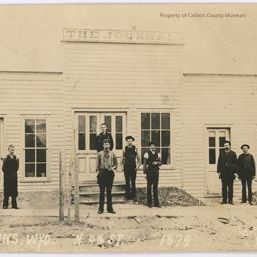 Sepia print. Snapshot. Printed on postcard paper. Unused. Image of seven men standing in front of a clapboard building identified as : "The Journal". Printed on bottom in white on original negative: "Rawlins, Wyo. N. 4th St. 1879". "Copy by Meyers" inside a square. Printed on back " Post Card" "Correspondence" "Address" "AZO" in a circle around a square line with "Place Stamp Here" in the middle.