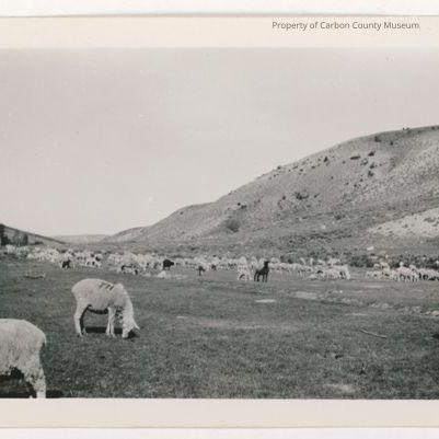 Update 2009: Black and white print of flock of sheep. Left 1/2 inch of print is white/anomaly on negative. Sheep in foreground has a PH brand. There are three black sheep visible. Sheep are standing on level ground but hills are visible in background.