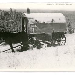 Update - 2009: Black & white print of sheep wagon setting in snow. There is a horse standing near front of wagon. A wash tub sets on ground. Other supplies are on the ground beside wagon. All are covered with a layer of snow. In the distance & behind the wagon are pine trees with a fine layer of snow on them.