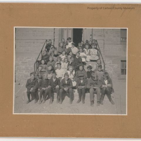 Update - March 2010: black & white print attached to a tan matboard. Image shows school children & several women on the front steps of a sandstone building. They are posed in seven horizontal rows. There are iron hand rails on each side of stairs. There are double doors at top of stairs with one door ajar.