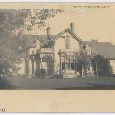 Sepia print on cream mat. Image of a large, two story, ornate home. Roof is steep with a couple of dormer windows. A section in center extends at a different angle & has a door leading to a balcony on left side. A decorative rail is around the balcony. Below balcony is a porch with column posts. A lower section on extension has a bay window. On lower level, decorative trim is around doors & window.s A small open porch is on photo right side of bay window. Small trees are next to the house & a larger one in front on photo right. Lawn is surrounding the house along with bushes. Above bay window on the second level is a three pane window with decorative trim under eave of roof.