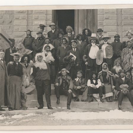 Update - September 2010: Black & white print. Image of a group of approximately 30 men dressed in costume. They are sitting & standing on the steps of a stone building with wood double doors. Their faces are painted, they have on wigs, some in women's clothing with large hats. One is dressed as a jester, another with a mule's head & two with what looks like bottoms of a wash tub to be used as cymbals. Several are holding or smoking cigars. One man on far left has on a Shrine Fez & is wearing a long, heavy coat, white shirt & bow tie.