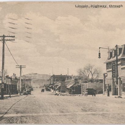 Black & white print card of Cedar Street. On photo left is Presbyterian Church & smaller buildings beyond. On photo right are business buildings: "Garage" and several more down the street with awnings out. A street light is on the corner by the garage & a gas pump is in front. Vintage cars are parked along the street on both sides & a pile of debris is on the street on photo right. Power poles are on photo left along the edge of the sidewalk. Printed in black at top right of card: "Lincoln Highway through Rawlins, Wyo."