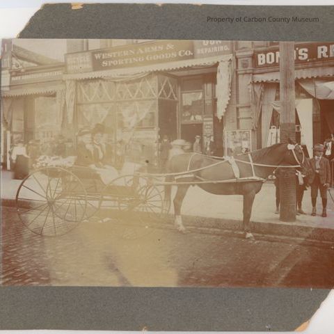 Update - March 2010: Black & white print attached to light gray matboard. Mat has been cut irregularly. Print shows two women in a four wheeled horse drawn buggy standing on a brick street with stores in the background. Signs on the building fronts read: Pawn Broker and Jewelers; Centennial Cleaning Co., Western Arms & Sporting Goods Co. Other people are seen on sidewalk at various locations looking in stores, standing in doorways & walking down sidewalk.