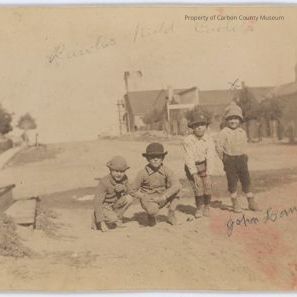 Sepia print of four children on a dirt street. Two boys are squatting by wood steps on photo left. Next to them standing are two girls standing. All children have hats on their heads. In the background is the steeple of the Presbyterian Church, Morris Chapel, St. Joseph's Catholic Church in the distance. Written on front: "Rawlins Kidd Kadets John Lane"