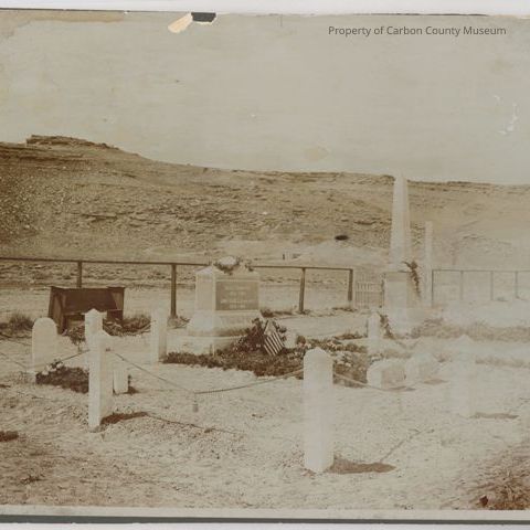 Update - 2009: Black & white print on brown mat. Image of graves in the cemetery. White stone posts with chains between each post surround the grave site. A decorative fob hangs from the middle of each chain. A large head stone reads: "Isaac Thompson 1825- 1901. Anne Isabella, his wife 1926 -1901" "THOMPSON" at bottom. At the foot of the graves are two more markers: "Father" and "Mother" is written on them. Another tall headstone is seen to the photo right. A fence of wood posts and wire is around a cementers and a wood bench is setting next to the fence. Rawlins uplift is seen in the distance.
