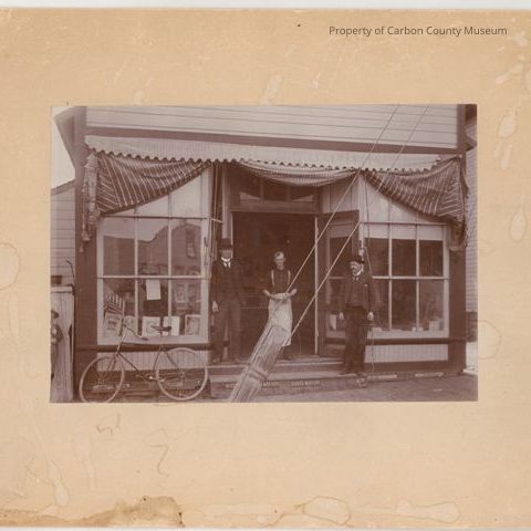 Copy 4. Typed on back on white adhesive tags: "Man on left is Al Carr. Taken in about 1895 or 1896, the building is probably a cigar store on 4th Street. Zingsheim ran cigar store from Nov. 1912 to 1930 bought from Alfred Johnson estate Rawlins, Wyoming" Stamped in black: "Copy provided by the Wyoming Archives & Historical Department". "Neg. No. 6656 Print No. 107"