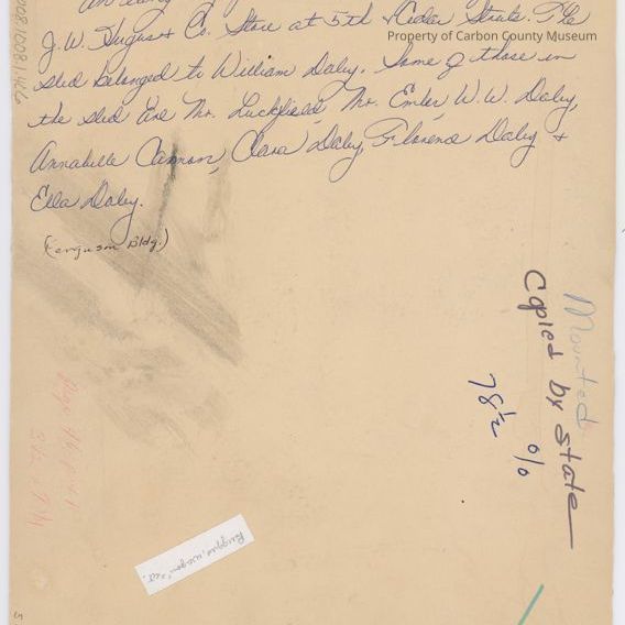 Copy. Stamped on back in black: "Copy provided by the Wyoming State Archives & Historical Department" In black ink: "an early day picture taken in front of the J. W. Hugus & Co Store at 5th & Cedar Streets. The sled belonged to William Daley. Some of those in the sled are Mr. Luckfield, Mr Emler, W. W. Daley, Annabelle Cannon, Clara Daley, Florence Daley, & Ella Daley" "Neg No 5263".
