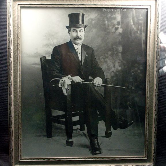 Update June 2011: Black and white print of Mr. Peter Johnson, full length portrait, man seated in chair, top hat, __ & cane in his hand. Wood frame is carved & painted grey and silver.Collection
