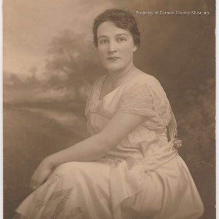 Black & white studio print. Image shows woman with dark hair in an updo posed with her left arm crossed over her lap & leg. She is sitting at a slight angle. She is wearing a white dress with wide neck & drape type blouse with a sash draped from back area along waist to adjoin the front. A pendant type necklace is hung at her neck. A nature scene serves at backdrop with threes & stream seen at side left.