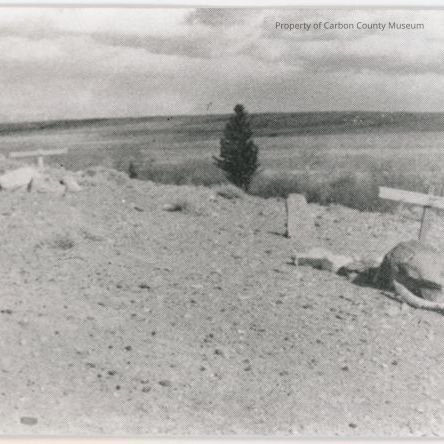 View 1. Black & white glossy snapshot. Image shows a desolate barren area with lone evergreen at center & sagebrush at center. In rocky foreground are two small wooden crosses held in place by large stacks of big rocks. A small headstone? is at center.