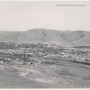 Black & white glossy print. A birdseye view of town situated at the base of a small mountain. The community is spread out & another smaller southern section of the town is separated from the northern part by a long railroad track which runs left to right across the print. Foreground & mountain in distance are barren.