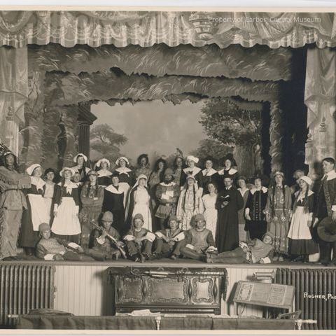 Update 1/2008: A black and white print of a group of older boys and girls standing on a stage dressed in a mixture of costumes: Quakers?, Indians and a Minister. There are four boys sitting and two boys reclining in the front row of the group. They are dressed in chain mall type shirts, pants made of a shiny fabric, and pith helmets. Five of these boys are holding long barreled rifles at various angles. At extreme left on second row is a tall boy dressed in fringed buckskin and wearing a feathered headdress. In the far right of this second row is another tall boy dressed in dark clothing with a 3/4 velvet? jacket with brocade facings and cuffs also with a bit white collar and white cuff. The stage has four tiers of ceiling and wall hangings framing the four rows of young people. The hangings seem to be printed fabric or sheaths of leaves. The far background scene is of trees in various sizes and sky. Below the stage are two radiators on each side of an ornately carved piano of its upper console. To the right is a music stand with two separate sheets of music: Album: Waltz and Concert Album. A pole with dark fabric hangs in front of the lower stage area in front of the piano and music stand.