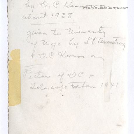 Written on back in pencil: "Refractor type, 5 inch lense, telescope which he built about 1938. This telescope was given to the University of Wyoming by Messrs. L.E. Armstrong and D. C. Kinnaman." "Picture of D.C. Taken 1941.