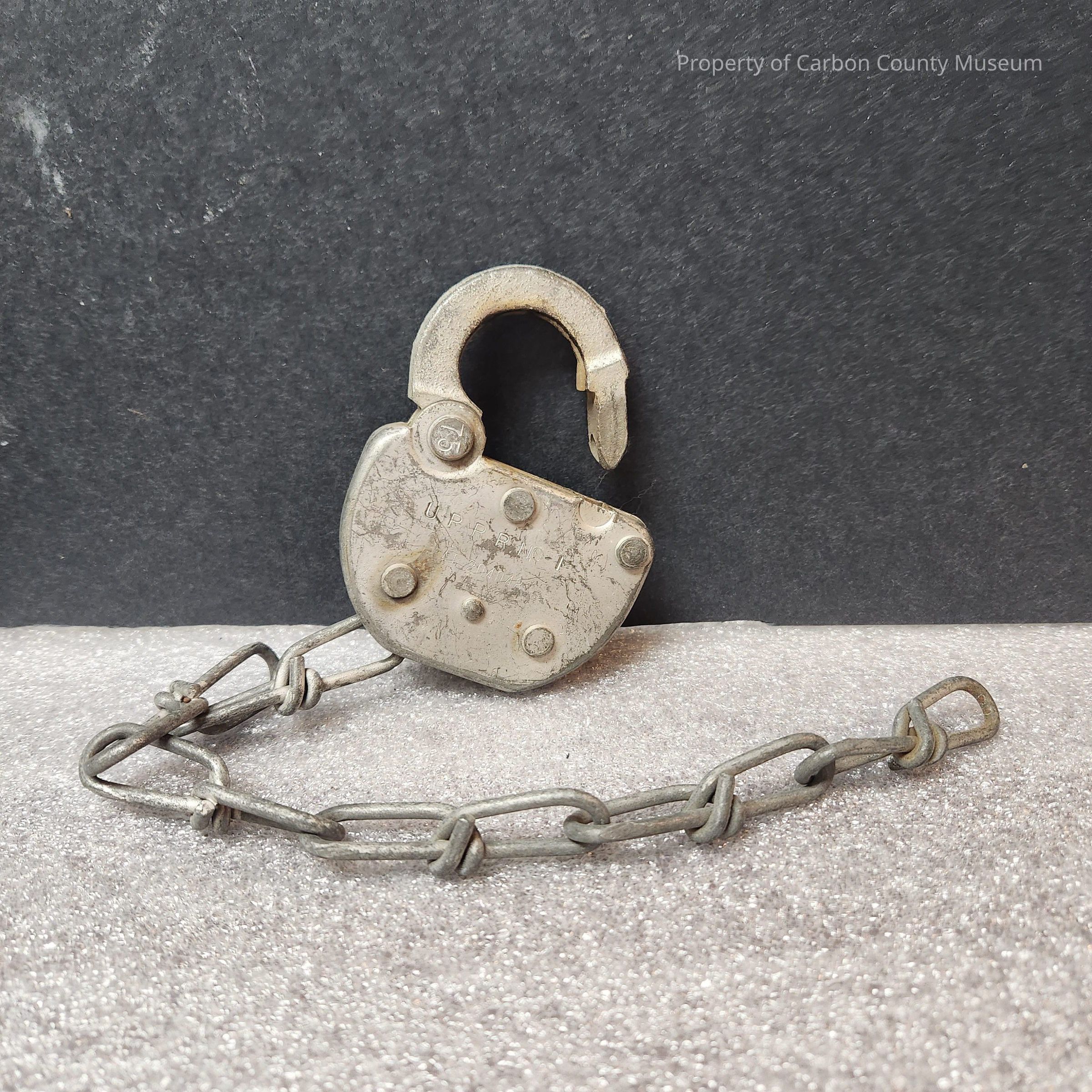 Padlock with attached chain. Front face of lock has "UP R R NO - 1" and "PAT 204048" imprinted on it, "75" is imprinted on one of the bolts. The reverse face has a cover over the keyhole, "ADLAKE" is embossed on the cover.Collection