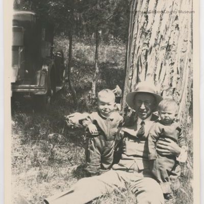 Update 1/2008: Black and white glossy print of "Grandpa" John Buchanan with grandsons John Niland and Gerald Felton ca. 1929. The photo shows Mr. Buchanan sitting on the ground with his legs stretched out in front of him in a V leaning up against a large tree trunk. He has each of his arms around the waist of a standing toddler. They are standing next to his torso on the outside of his legs. The toddlers are dressed in similar zipped one piece, long sleeved, long pant, jumpsuits. Mr. Buchanan is dressed in a light colored 3 piece suite with dark tie. He is also wearing glasses and a light colored hat with medium brim and crown. He has medium colored 3/4 lace up shoes on his feet. To side left of photo is a black vintage automobile. The scene appears to be in the country with trees and tall vegetation in the background.