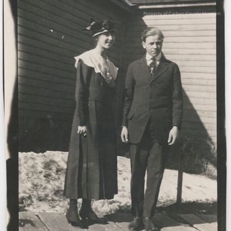 Update 1/2008: Black and white glossy print of Garnet Buchanan and an unidentified female friend standing together on a wooden sidewalk in front of a section of a light colored framed house. Remains of snow pack shows on ground behind them with dormant vegetation in foreground. The friend is wearing 3/4 length black longsleeve pleated dress with high top laced shoes. her dress has a large white collar with her left hand touching it at bodice front. Her hat is short brimmed and decorative. Garnet is dressed in dark 3 piece suit and tie. He has dark tie shoes on his feet. His hair is "slicked" straight back and both his arms are hanging at his side. Female friend is smiling into camera while Garnet has a more serious demeanor.