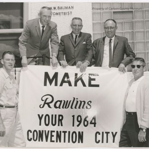 Black & white print. Image shows a group of five men holding a white sign with black writing that reads: Make Rawlins your 1964 Convention City. The three men holding the top of the sign are standing on a high porch area leaning over a black ornamental rail while the other two men are holding each side of the sign standing down below. A sign on the building to right of door: W. W. Bauman Optometrist is in black letters. Security paned windows is at side right.