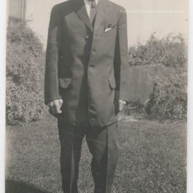 Update 1/2008: Black and white print of Edwin Buchanan, standing in a grassy yard dressed in a dark colored two piece suit, white shirt, and tie. he has a multi-colored hankerchief in his left breast pocket. He is wearing a medium colored hat with medium brim and crown. His jacket appears misshapen on bottom front edge. The corner of a house and shrubs show on left side of photo. Right background has a wide plank wooden fence and shrubs showing. He has tie shoes on his feet and the shoestrings appear to be very wide.