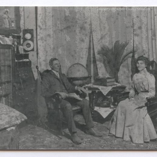 Update 2009: Black and white copy print of a couple dressed in Victorian clothing seated in wooden rocking chairs and cluttered living room. Bookcase seen side left filled with books, a secretary is to photo right with many decorative objects. A weather vane is on wall and a globe is in front of draperied window. A small round table is filled with large books and objects. A pattered rug covers the floor. A leafy fern type plant is seen in background by window.