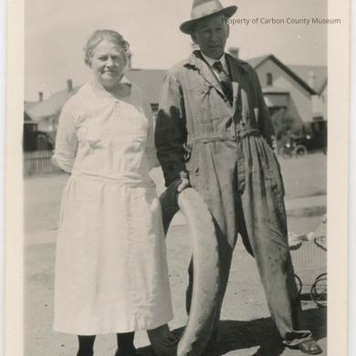 Written on back on a glued on white sticker in black ink: "John & Evelina Buchanan, grandparents of John Niland in backyard of Felton house 122 W. Pine about 1925. Married in P.E. Island, Canada. Came to Wyo in 1889. Mr. Buchanan was County Clerk. Mr. & Mrs. Roach (W.S.P. Warden) lived in the house in the background. Then moved into house on pen grounds when it was build about 1935. A model T Ford is in background."