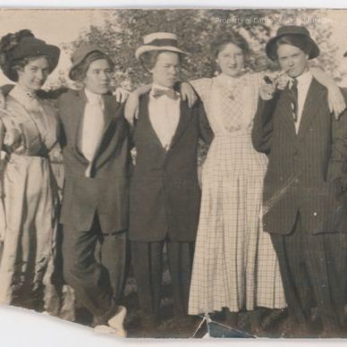 Update 2009: Black and white print showing six women in a horizontal line. Two women in dresses and other four are dressed in men's suits, ties or bow ties and hats. One is "smoking" a pipe. They are standing in a yard with a picket fence seen side left and a leafy tree behind them.